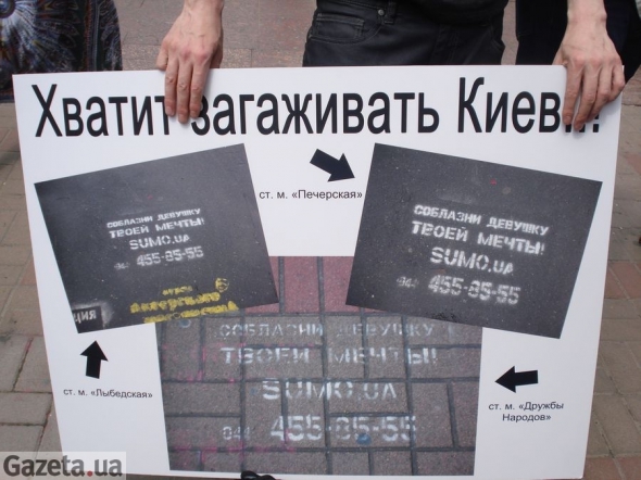 Около 20 человек провели акцию "Хватит загаживать Киев!". В рамках акции они лично мыли тротуары возле метро от реклам тренингов "Как соблазнить девушку" и срывали бумажные наклейки со столбов вдоль бульвара Леси Украинки, очищая столицу от "рекламного грязи".