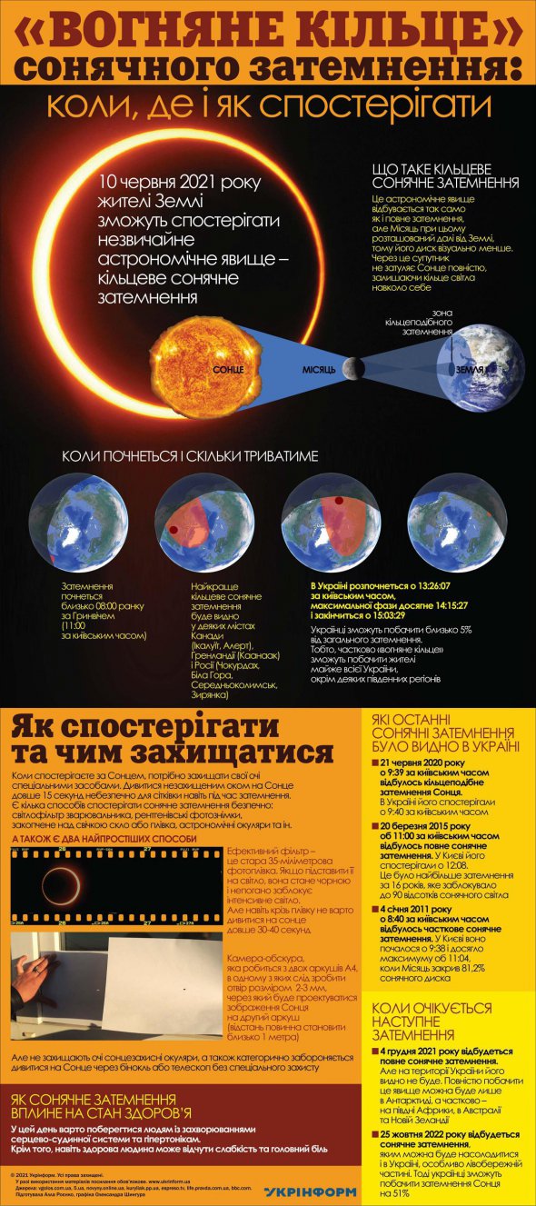 Лучше всего его будет видно с некоторых территорий Канады, Гренландии и России, пишет Indian Express. Частично "огненное кольцо" смогут увидеть и жители Украины. Наблюдать, как светило понемногу скрывается за тенью, можно будет с 11:12, а максимальная фаза затмения ожидается в 13:41 по киевскому времени и продлится около 1,5 ч.