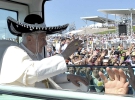Как только Папа получил в подарок шляпу - он сразу же одел ее на голову и начал приветствовать мексиканцев из открытого папамобиля.