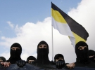 Впереди участники колонны несли хоругви, имперские флаги (черно-желто-белого цвета), а также флаги с символикой ДПНИ и "Славянского союза".