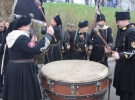 В 10.00 под звуки огромного полкового тулумбаса "Черных запорожцев" начинается официальная часть почестей. Выступающие толпятся на возвышении возле памятника Героям Холодного Яра. Большинство митингующих ниже на дороге. Писатель Роман Коваль делает краткий экскурс в события 20-х годов и борьбу холодноярцев против советских оккупантов.