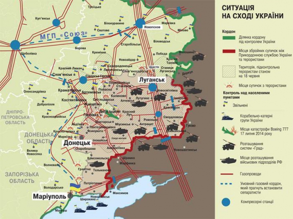 Кроме того, в Донбасском регионе находятся два ПХГ - Вергунское (в нем сейчас хранится более 176 млн кубометров газа) и Краснопоповское (с запасом 19,5 млн кубометров). Эти подземные хранилища использовались в сезонный максимум для поддержания давления в транспортном узле "Донбасстрансгаза" и обеспечения Донецкой и Луганской областей стабильным газоснабжением. Если на карту АТО, которую легко найти на сайте СНБО, наложить схему газовой инфраструктуры региона, то четко просматривается, что боевики ведут боевые действия аккуратно по линии прохождения газомагистралей и важнейших газораспределительных узлов в Луганской и Донецкой областях. Боевики пытаются отсечь территорию, по которой проходят газопроводы из российских Ельца, Петровска, Оренбурга и в направлении Александрова Гая и Таганрога. То есть в прямом смысле слова под прицелом оказались не менее трех входящих и двух выходящих магистральных газопроводов в Луганской и Донецкой областях.