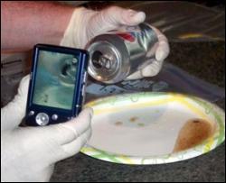 Американка вытряхнула предмет на бумажную тарелку и сделала несколько снимков на цифровой фотоаппарат. В банке оставался более крупный предмет, вытряхнуть который не получалось. По мнению Эми Денегри, это тело мыши или небольшой крысы, а извлеченный из банки фрагмент - мышиный хвост.