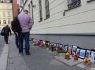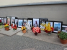 Фотографии с именами и возрастом погибших в черных рамках стоят у стены. Перед ними находятся иконки, цветы и свечи. На некоторых лампадках есть надпись "Слава Украине - Героям Слава". К столбу привязаны два флага - Украины и Польши.