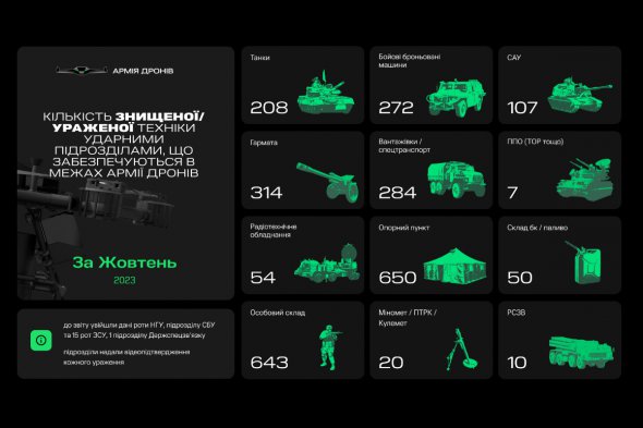 За последний месяц "Армия дронов" поразила 175 вражеских танков, 245 орудий и 90 самоходных установок, свидетельствуют данные Министерства цифровой трансформации за 3-31 октября.