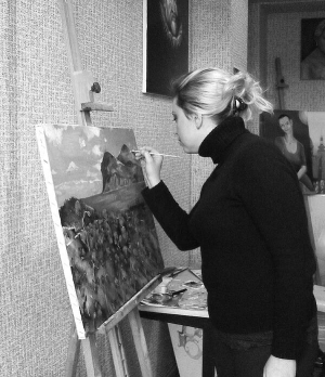 — Дома работать — это постоянные запахи масляных красок и уайт-спирита. И все родственники должны этим дышать. Эта комнатка хорошая, но маленькая. Нам бы большое помещение. В идеале — на 100 квадратов, — добавляет Татьяна Мовчан, 35 лет.