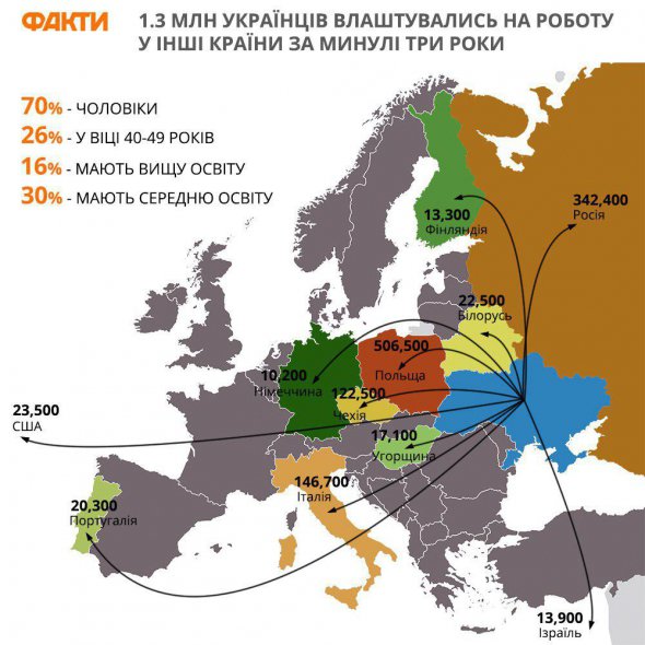 По меньшей мере, 1,3 миллиона украинцев выехали на заработки за границу с 2015 по 2017 год. Люди в основном ехали до Польши и России.