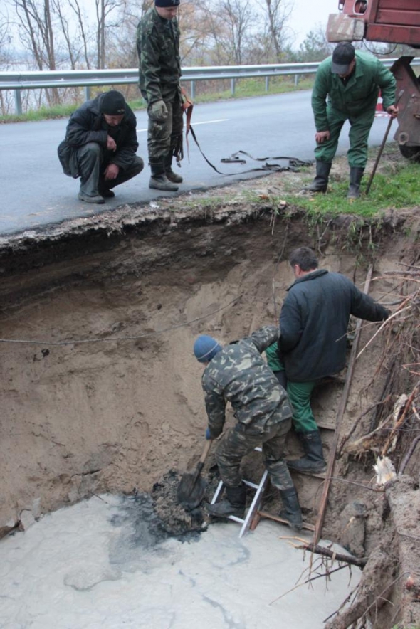 Напомним, что 8 ноября возле Шевченковского национального заповедника в Каневе произошла авария. Яма у дороги на Пекари начала расширяться и захватывать дорогу. Глубина достигает двух метров. Там проложена труба 800 мм. В верхней части разрушился асбест. Нечистоты постоянно откачивает машина ассенизаторов.