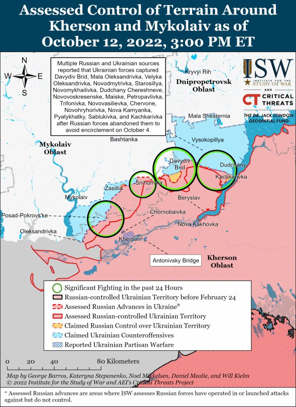 "12 октября украинские войска проводили контрнаступательную операцию в северо-западной и западной части Херсонской области. Российские источники также утверждали, что украинские войска пытаются продвинуться мимо Давида Брода на западе Херсонской области. А несколько военных блогеров отмечают, что украинцы атаковали в направлении Ищенки и Костромки (оба в пределах 10 км к югу от Давидова Брода)", – отмечают в ISW.