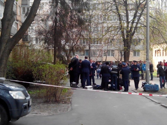 Над телом погибшего журналиста Олеся Бузины сейчас работают эксперты. Место гибели оградили красными лентами, но это не останавливает журналистов и зевак.