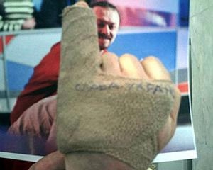 Украинский художник Сергей Поярков, подравшийся в минувшую пятницу в прямом эфире ТВ с писателем Олесем Бузиной, ходит с гипсом, на котором чернилами выведена надпись "Слава Украине".