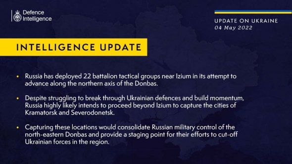 Несмотря на то, что Россия пытается прорвать украинскую оборону и наращивать импульс, скорее всего, оккупанты намерены выйти за пределы Изюма, чтобы захватить Краматорск и Северодонецк, сообщает Минобороны Великобритании.