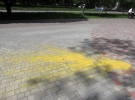 Одна из бутылок разбилась на тротуарной плитке. Краска не успела засохнуть.