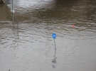 "Лучше помогайте, а не фотографируйте", - кричит работник в оранжевом спецодежде к людям, фотографируют реку в центре Дрездена.
