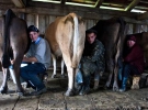 На струнці - місці, що розділяє дві частини кошари, - паркан суцільний і є дашок із залізних листів. Тут із міцно затисненими між ногами відрами сидять четверо доярів. Вони - у заляпаних брудом гумових чоботях, що не миються місяцями. На годиннику 5.30, над горами сходить сонце.