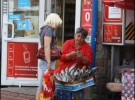 Она вынимает из бумажника 5 грн. Милиционер засовывает их в карман штанов, идет дальше.