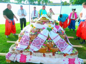 Организаторы просят богатырей вынести из палатки на сцену 600-килограммовый каравай. Он попал в Книгу рекордов Украины как самый большой. Для теста использовали 600 кг муки, 1 тыс. яиц, 15 кг масла, 1 кг маргарина, 30 кг сахара и 6 кг дрожжей.
