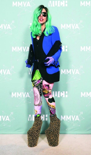 Американская певица 25-летняя Леди Гага на вручение музыкальной премии "Мач мьюзик видео" пришла в черных кожаных туфлях на 35-сантиметровых платформах. Они украшены тысячей металлических заклепок.