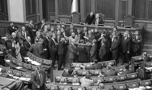 Вице-спикер Николай Томенко прибавляет, что "бютовцы" не будут принимать участие в работе парламента, пока депутаты не декриминализируют статью, по которой осудили Тимошенко. Возле трибуны собираются меньше половины членов фракции. Поочередно подписывают постановление о роспуске Верховной Рады. Их - 150. Литвин ведет заседание, будто ничего не происходит. Вместо выступления с трибуны предлагает говорить с места. За час "бютовцы" освобождают трибуну.