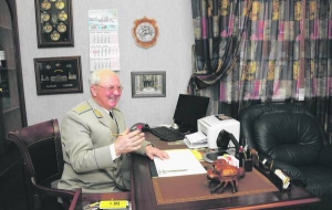 Александр Скипальский встречает в серых генеральских штанах с лампасами и кителе.