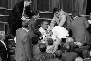 Во время обсуждения депутаты от Партии регионов стали около президиума, защищая его от возможного набега оппозиционеров. Но оппозиционеры блокировали трибуну. До голосования оставалась 1 мин., когда нунсовец Андрей Парубий пробрался к президиуму и выхватил стул из-под спикера Владимира Литвина. Тот закрыл заседание и ушел из зала. Представители оппозиции пошли в наступление на ряды "регионалов". Кто-то перескакивал ограждение, кого-то через него перекинули. "Регионалы" сбрасывали с себя пиджаки, галстуки и выталкивали оппозиционеров назад в зал. Кто-то бросил стеклянную бутылку минералки. Она пролетела над толпой и ударилась о стену.