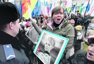 — Главное — Юлю освободить. Европа тогда нас к себе заберет. Вот и пришла сюда, — говорит 21-летняя Юлия Фарина, студенка из Львова. Несет флаг УДАРа.