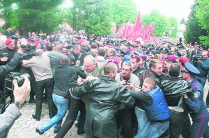 Коммунисты и националисты начинают ругаться. Отец нардепа-коммуниста Александра Голубя 69-летний Владимир Голуб достает из-под куртки красный флаг. Разворачивает его и поднимает над головой. На него сразу же бросаются несколько националистов. Хватают флаг. Пытаются порвать. С две десятка милиционеров бросаются в толпу. Оттаскивают националистов. Коммунистов берут в кольцо, хватают их за руки. Выводят к своим автобусам.