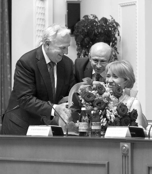 Министр здравоохранения Александр Анищенко привстает. Слушает Клюева, склоняет голову.