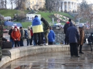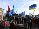 - Стаем в строй, давайте, быстрее! Колонна пошла! - В 11:50 возле столичной гостиницы "Днепр" человек в голубой накидке "Партия Регионов" в мегафон собирает людей на Европейской площади, идут колоннами по улице Грушевского со стороны метро "Арсенальная". Здесь с ночи обустроили большую сцену. Сходится около 7 тысяч человек с флагами Партии регионов, Европейского союза и государственными.