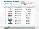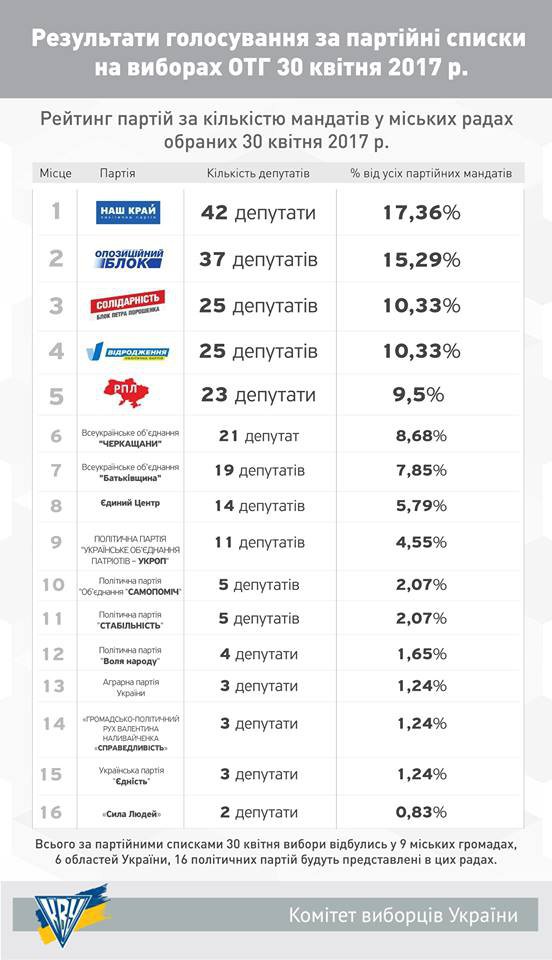 По партийным спискам на выборах в ОТГ победил "Наш край". 42 представителя партии стали депутатами. Это 17,4% от общего количества.