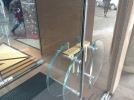 Охранники офиса СКМ заблокировали центральный вход и наблюдают за происходящим изнутри.