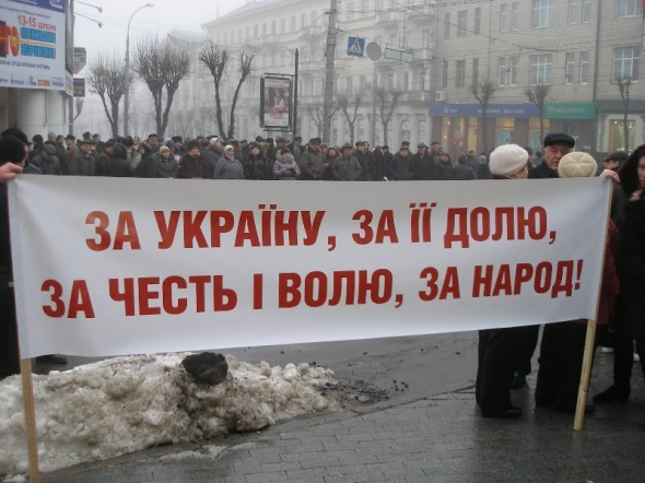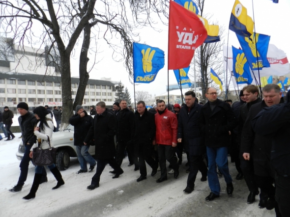 Несколько десятков активистов развернули 40-метровый флаг Украины. Сплотились в колонну, двинулись по ул. Соборной к помещению Винницкой облгосадминистрации. В это время милиционеры перекрыли движение транспорта по центру города. К митингующим присоединились жители города, оказавшиеся неподалеку. Колонна растянулась на всю ширину улицы. Перед собравшимися выступили лидеры оппозиционных сил. Через несколько часов митинг завершился.