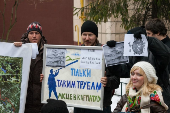 Во всемирный день борьбы против плотин на реках, возле офиса ЕБРР состоялась акция протеста против построения малых ГЭС в Карпатах. Как объясняют активисты, ЕБРР выдал кредит на строительство малой ГЭС в с. Голошино и есть риск что будут прокредитованы еще десятки малых ГЭС на Ивано-Франковщине и Закарпатье. На пикет пришли пару десятков активистов.