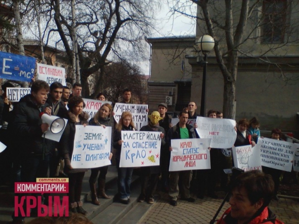 Сотрудники крымской обсерватории вышли с пикетом под стены представительства президента Украины в Крыму. Требования пикетчиков - отменить приказ о передаче обсерватории в управление киевскому университету им. Шевченко. Всего в акции приняло участие несколько десятков человек. На акции с астрономами был замечен персонаж фильма "Звездные войны" Джедай Йода.