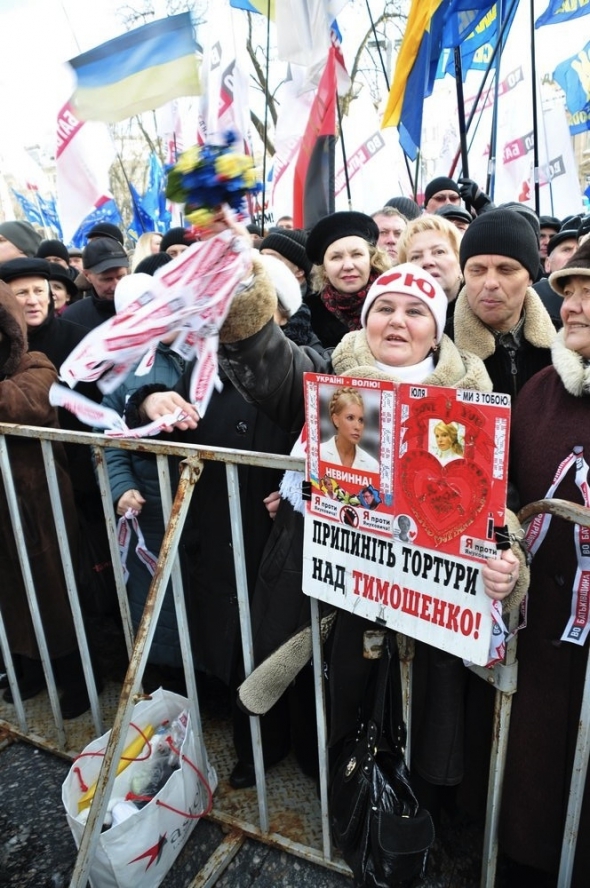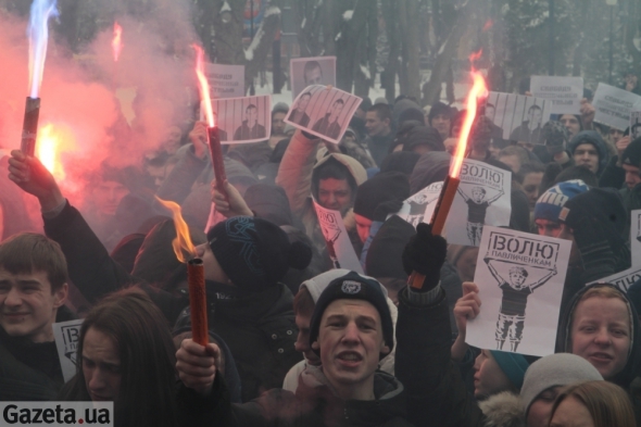 Началась всеукраинская акция протеста оппозиции "Вставай, Украина!". У бывшего кинотеатра "Россия" собралось около 5 тысяч представителей трех политических партий - "Батькивщины", "Свободы" и "УДАР". Приехали Олег Тягнибок, Арсений Яценюк, Николай Катеринчук, Андрей Мохник, Алексей Кайда, Игорь Зубко.
