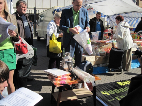 - Сегодня мы угощаем всех конфетами от Черновецкого. Самого его уже давно с нами нет, зато ученики остались, - говорит в микрофон кандидат в депутаты избирательного округа № 221 г. Киева, председатель гражданской кампании "Форум спасения Киева" 46-летний Виталий Черняховский. - Алла Шлапак подкупает избирателей. Мы зафиксировали эти факты неоднократно. Впервые 16 сентября в школе № 127, во время встречи с жителями района Батыева Гора. И после этого еще дважды. Требуем наказать ее, или, хотя бы, обязать прекратить эту незаконную деятельность. Эти конфеты и чай с пайка, который раздавала сама Алла Шлапак избирателям в школе № 127. Первую жалобу мы написали 21 сентября. В ЦИК рассматривалась 22. Решение было - передать ее в милицию. Впрочем тот же день мы зафиксировали такие же нарушения Аллой Шлапак и ее штабом. Поэтому завтра подадим жалобы и в ЦИК, и в суд. У нас есть доказательства, фото и видео-метариалы.
