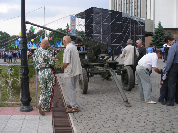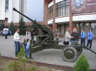 У областной филармонии стояла пушка времен 2-й мировой войны, у которой с интересом крутились дети и фотографировались взрослые. Не касались вниманием они и военное транспорт.