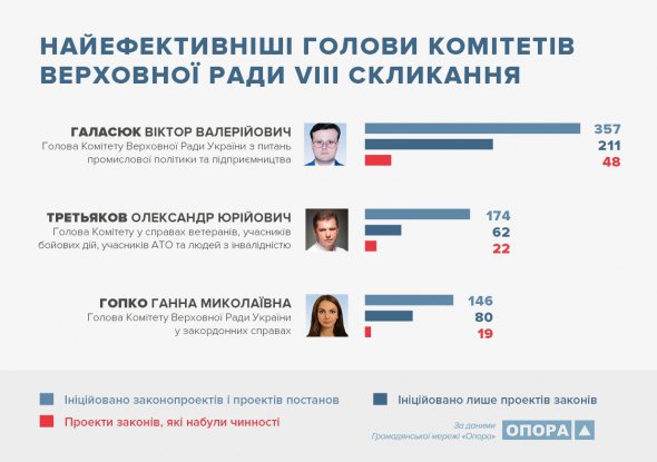 Наиболее успешными руководителями комитетов Верховной Рады по количеству принятых законопроектов стали народные депутаты Виктор Галасюк (фракция Радикальной партии), Александр Третьяков (фракция БПП) и Анна Гопко (внефракционная). Об этом свидетельствуют данные Общественной сети "ОПОРА".