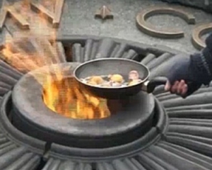 Печерским райотделом милиции Киева возбуждено уголовное дело против трех ребят из арт-группы "Яйцо", которые 20 июня, в день встречи президентов Януковича и Ху Цзиньтао жарили яичницу на Вечном огне в парке Славы в Киеве. Еще три яичницы приготовили в поддержку Анны Синьковой, активистки общественного движения "Пора", которая уже три месяца содержится в СИЗО по обвинению в совершении надругательства над могилой.