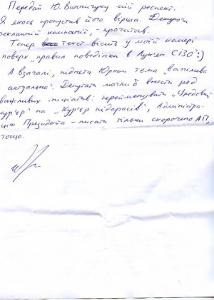 "Передай Ю. Винничуку мой респект. Я как-то пропустил его стихотворения. Благодаря рекламной кампании - прочитал. Теперь текст висит в моей камере сверх "Правил поведения в Лукьян. СИЗО":)".