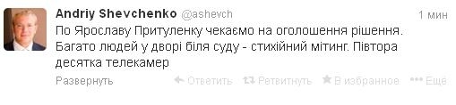 "По Ярославу Притуленко ждем оглашения решения. Много людей во дворе возле суда - стихийный митинг. Полтора десятка телекамер", - написал он.