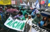 Участники акции держат в руках плакаты с надписями: "Не отдадим Кремлю наш суверенитет!", "Прочь российский империализм!", "Москва, покайся!", а также флаги ВО "Свобода", Народного Руха Украины, Конгресса украинских националистов, а также государственные флаги.