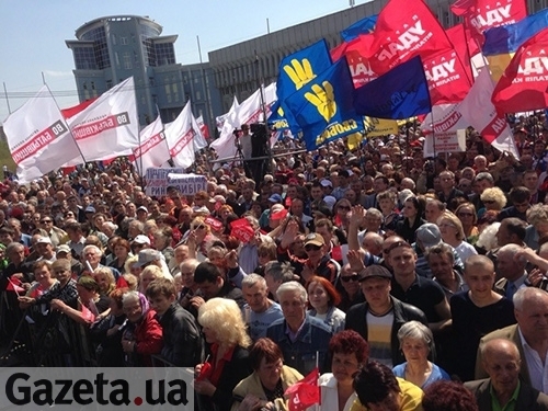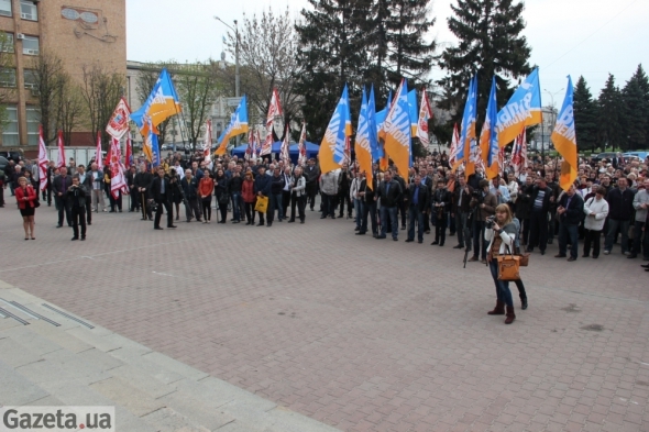 В тоже время на соседней Соборной площади параллельно митингу оппозиции, Партия регионов и коммунисты устроили празднование Дня победы. Они установили сцену и около 50 партийных палаток. На площадь пришло около 200 человек с георгиевскими ленточками на одежде. Посреди площади двое людей держали плакат "Нет фашизму в Украине". Рассказали, что большинство из них - это учителя и работники администраций.