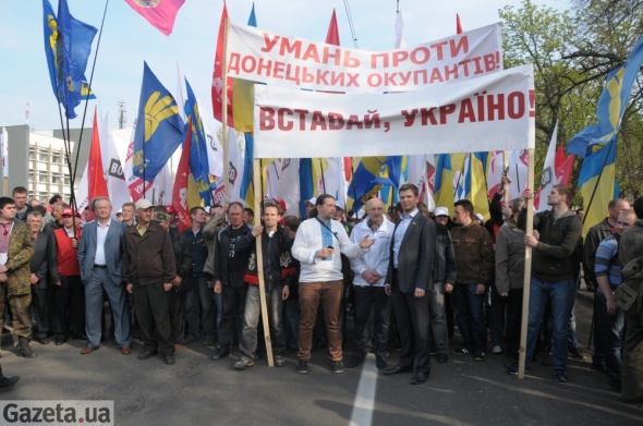 В Черкассах прошла акция "Вставай, Украина". В 16.00 на площади у дворца культуры "Дружба народов" собралось до пяти тысяч человкек. Впереди колонны встали лидеры оппозиции Арсений Яценюк и Олег Тягнибок, народные депутаты. Лидер УДАРа Виталий Кличко опоздал на 20 минут и приехал уже на Театральную площадь, где потом проходил митинг.
