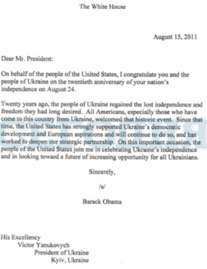 "От имени народа США я поздравляю вас и народ Украины с двадцатой годовщиной независимости, которую вы отмечаете 24 августа", - говорится в письме Обамы Януковичу.