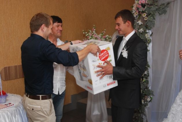 "Было две свадьбы. Есть информация, что он был на трех свадьбах. Относительно третьей информация пока еще не совсем подтверждена, потому что мы должны увидеть видео и фотографии. Мы к нему когда позвонили и спросили, он там был, сказал, что был. Он не спрашивает, что подарить. Перед тем как прийти на свадьбу, он или его представители спрашивают предварительно разрешения у родителей, можно ли прийти на свадьбу, поздравить молодых. Родители ему обычно не отказывают. Он и на той, и на той свадьбе дарил кухонный комбайн. Такие действия субъекта избирательного процесса Константина Якименко является нарушением требований части тринадцатой статьи 74 Закона Украины "О выборах народных депутатов Украины". Это косвенный подкуп избирателей. Кухонный комбайн стоит как минимум полторы тысячи гривен ".