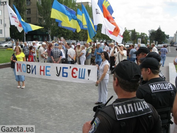 Когда около 30 националистов пришли на свой митинг, им показали решение областного административного суда и оттеснили их, освободив место для массового митинга "регионалов". Милиция отказывалась пропустить в здание обладминистрации, где проходила внеочередная сессия облсовета в поддержку регионального русского языка, местных правозащитников и оппозиционных кандидатов в народные депутаты.