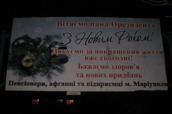 В Мариуполе на улице Карла Либкнехта на одном из билбордов размещено поздравление с новым годом, адресованное президенту Виктору Януковичу, пишут блогеры.