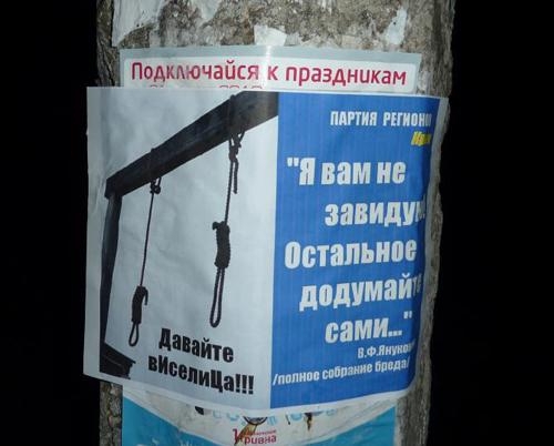 Кроме того, по словам тех же блогеров, в Симферополе расклеены листовки с изречением президента Виктора Януковича, произнесенным им на итоговой пресс-конференции за 2011 год: "Я вам не завидую! Остальное додумайте сами...".
