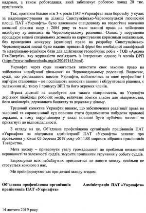 Все это непосредственно касается прав и интересов трудового коллектива "Укрнафты" – крупнейшего нефтедобывающего предприятия Украины. Потеря лицензии на добычу для такого предприятия как "Укрнафта" равна ликвидации более 20 тыс. рабочих мест, огромным убыткам для предприятия, потере рентной платы местным бюджетом и налогов для Государственного бюджета.